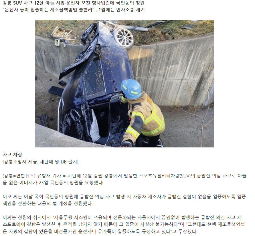 작년 12월 강릉에서 발생한 SUV 급발진 사고로 인해 아들을 잃은 아버지가 국민동의 청원을 요청하는 상황에서, 이씨는 급발진 의심 사고 발생 시 자동차 제조사가 급발진 결함이 없음을 입증하도록 책임을 전환하는 법 개정을 청원하셨습니다. 본 글에서는 이처럼 자동차 제조사의 책임을 높여야 할 시점과 그 이유에 대해 다루고자 합니다.